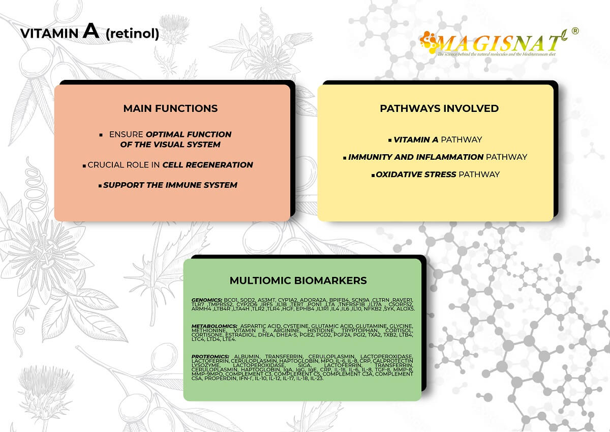 - Genomic: BCO1, SOD2, AS3MT, CYP1A2, ADORA2A, BPIFB4, SCN9A, CLTRN, RAVER1, TLR7, TMPRSS2, CYP2D6, IRF5, IL1B, TERT, PON1, LTA, TNFRSF1B, IL17A, IL6, C5orf52, ARMH4, LTB4R, LTA4H, TLR2, TLR4, HGF, EPHB4, IL1R1, IL4, IL6, IL10, NFKB2, SYK, ALOX5
