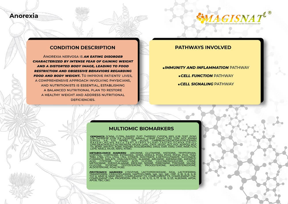 Anorexia nervosa is an eating disorder characterized by an intense fear of gaining weight and a distorted body image, leading to food restriction and obsessive behaviors regarding food and body weight. To optimize and improve the lives of patients with anorexia, it is essential to take a comprehensive approach involving a range of mental health professionals, physicians, and nutritionists. It is critical to establish a balanced nutritional plan that aims to restore a healthy body weight and address nutritional deficiencies that may result from dietary restriction. A multiomic and integrated approach can be an excellent alternative for understanding the mechanisms underlying this disease. Furthermore, after diagnosis, omic analyses can help identify simple dietary changes, nutritional supplements, physical activity, or lifestyle modifications that could improve the quality of life for individuals suffering from this condition.