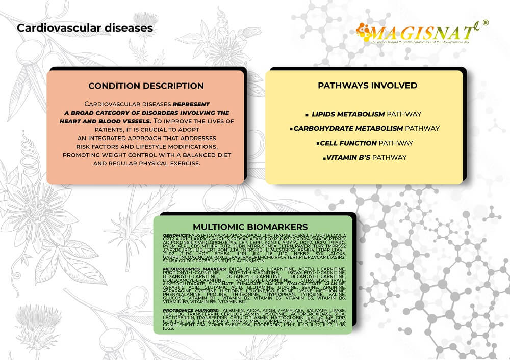 Cardiovascular diseases represent a broad category of disorders involving the heart and blood vessels, including conditions such as hypertension, atherosclerosis, myocardial infarction, heart failure, and stroke. These conditions can cause a range of symptoms and complications, compromising patients' health and quality of life. To optimize and improve the lives of patients with cardiovascular disease, it is critical to take an integrated approach involving risk factor management and lifestyle modifications. This may include blood pressure control, diabetes monitoring and treatment, cholesterol management, and weight control. A multiomic and integrated approach can be an excellent alternative for understanding the mechanisms underlying this disease. Furthermore, after diagnosis, omics analyses can help identify simple dietary changes, nutritional supplements, physical activity, or lifestyle modifications that could improve the quality of life for individuals suffering from this condition. In addition, it is essential to promote a healthy lifestyle that includes a balanced diet and regular exercise.