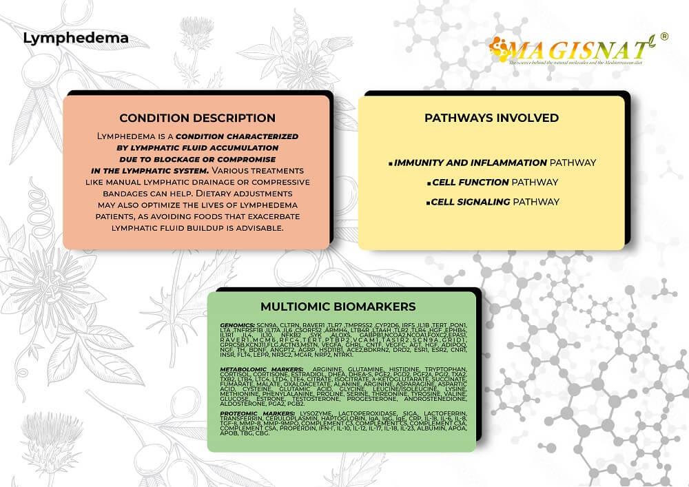 Lymphedema is a condition characterized by the stagnation of lymph in various districts of the body, often caused by a blockage or impairment of the lymphatic system. To optimize the lives of patients with lymphedema, several treatments are available. Lymphatic drainage, a manual massage that stimulates the lymphatic system, is particularly effective. Compression bandages, such as sleeves, help maintain a pressure gradient, while intermittent pneumatic compression is another option that can be used to improve lymphatic circulation in the extremities. A proper diet of food could also help those with lymphedema; it is advisable to avoid those foods that increase the accumulation of lymphatic fluid in the tissues. A multiomic and integrated approach can be an excellent alternative for understanding the mechanisms underlying this disease. Furthermore, after diagnosis, omics analyses can help identify simple dietary changes, nutritional supplements, physical activity, or lifestyle modifications that could improve the quality of life for individuals suffering from this condition.