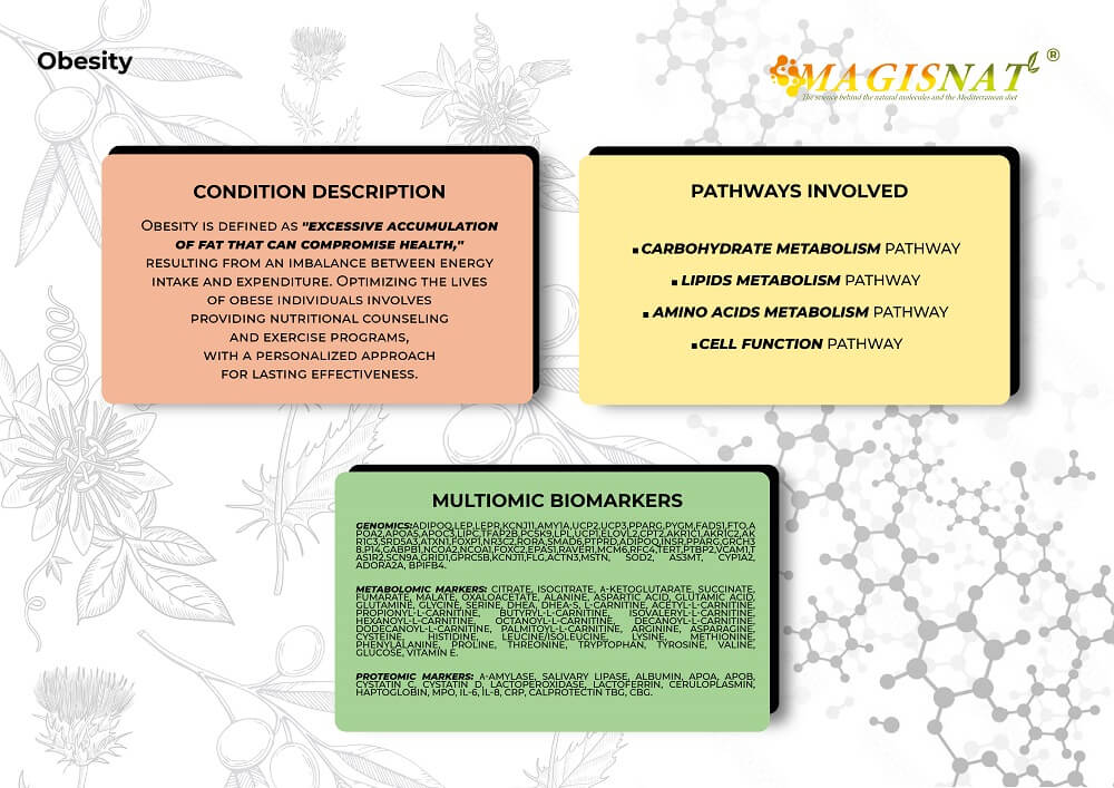 Obesity is defined as an excessive accumulation of fat that can compromise health. It results from an imbalance between energy intake through diet and energy expended on daily physical activities and basal metabolism. Optimizing the lives of obese people means providing them with tools and resources to improve their health and wellbeing. This can include nutritional counseling, exercise programs tailored to their needs. A personalized approach that takes into account individual needs is essential to ensure effective and lasting results. A multiomic and integrated approach can be an excellent alternative for understanding the mechanisms underlying this disease. Furthermore, after diagnosis, omic analyses can help identify simple dietary changes, nutritional supplements, physical activity, or lifestyle modifications that could improve the quality of life for individuals suffering from this condition.