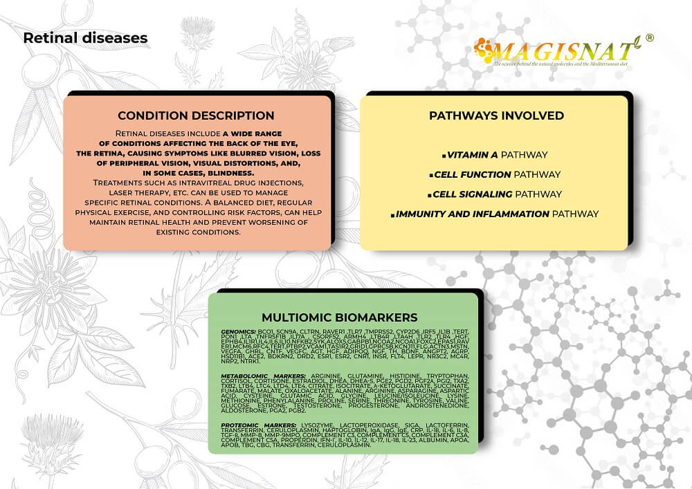 Retinal diseases include a wide range of conditions that affect the back of the eye, the retina, and cause symptoms such as blurred vision, loss of peripheral vision, visual distortions, and, in some cases, blindness. Treatments such as intravitreal drug injections, laser therapy, etc. can be used to manage specific retinal conditions. A balanced diet, regular exercise and control of risk factors can help maintain retinal health and prevent existing conditions from worsening. A multiomic and integrated approach can be an excellent alternative for understanding the mechanisms underlying this disease. Furthermore, after diagnosis, omic analyses can help identify simple dietary changes, nutritional supplements, physical activity, or lifestyle modifications that could improve the quality of life for individuals suffering from this condition.